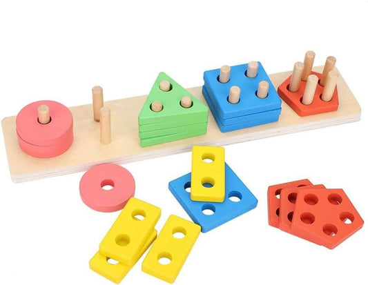 Voolex - Wooden Shapes Geometric Board Blocks Sorting and Stacking Toys for Kids - 4 Columns with 16 Pieces